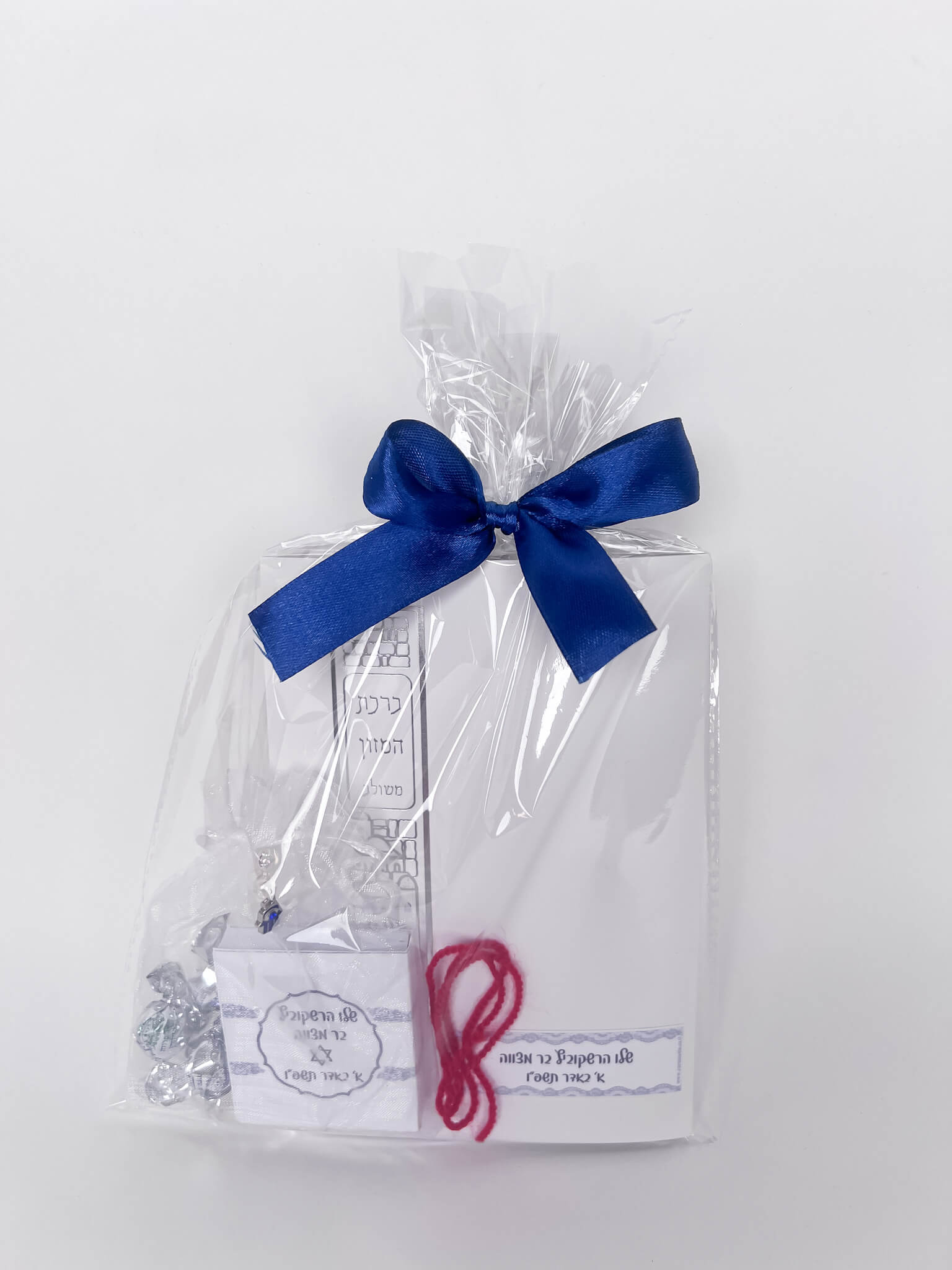המארז מכיל: ברכון מתקפל לאקורדיון ברכת המזון , גודל הברכון 12*18 ס"מ מגיע עם מדבקה ועליה כיתוב לבחירה, ספר תהילים ממותג עם סוכריות גודל התהילים 5*5 ס"מ מגיע עם שקית אורגנזה וחמסה כחולה, וחוט אדום. המארז מגיע ארוז עם צלופן וסרט סאטן.